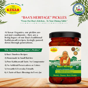 Rooted in the heart of Baa’s Kathiyawadi tradition, our Methi, Chana, Keri Pickle combines the bitterness of fenugreek seeds, the crunch of chana, and the tartness of raw mangoes — all brought together in a harmony of spices. This is not just a pickle; it’s a classic Kathiyawadi creation made the way our grandmothers did — slowly, lovingly, and with an unmatched depth of flavor that defines true heritage.