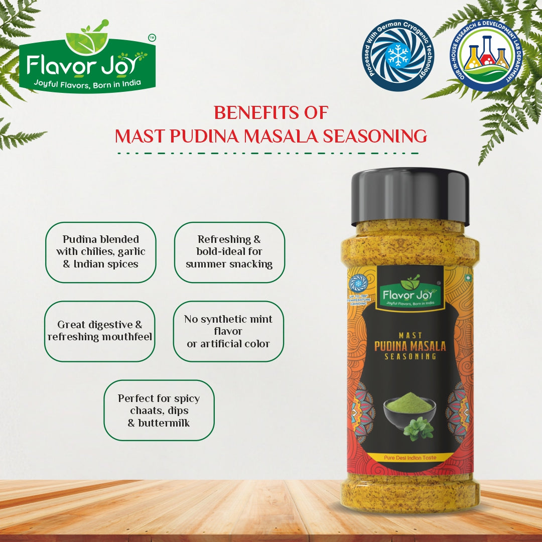 Cool, zingy, and bursting with Indian freshness, Flavor Joy’s Mast Pudina Seasoning blends real mint with onion, garlic, and Indian masalas for a refreshing twist. Use it on popcorn, khakhra, roasted nuts, or chaat for a minty burst that excites your senses and adds a cooling counterbalance to spicy dishes.